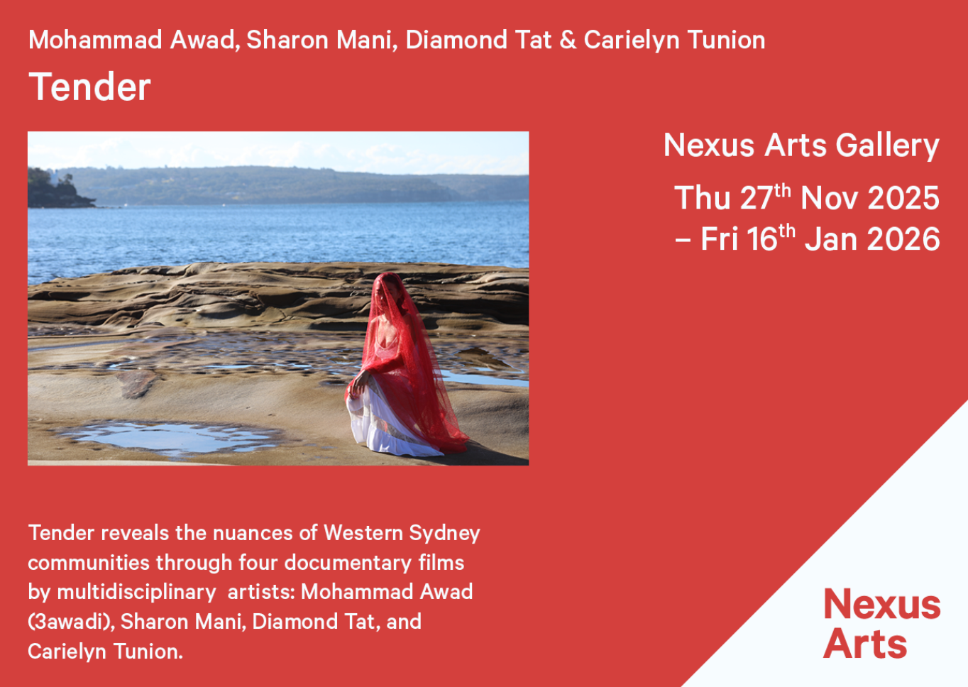Tender reveals the nuances and tender sides of the communities of Western Sydney through four individual but interconnected documentary films by multidisciplinary artists: Mohammad Awad (3awadi), Sharon Mani, Diamond Tat, and Carielyn Tunion.