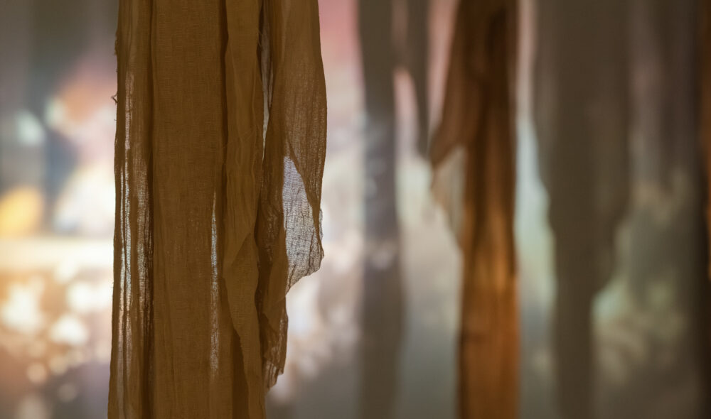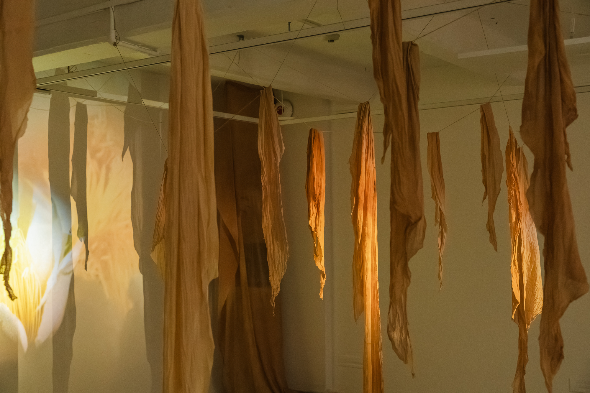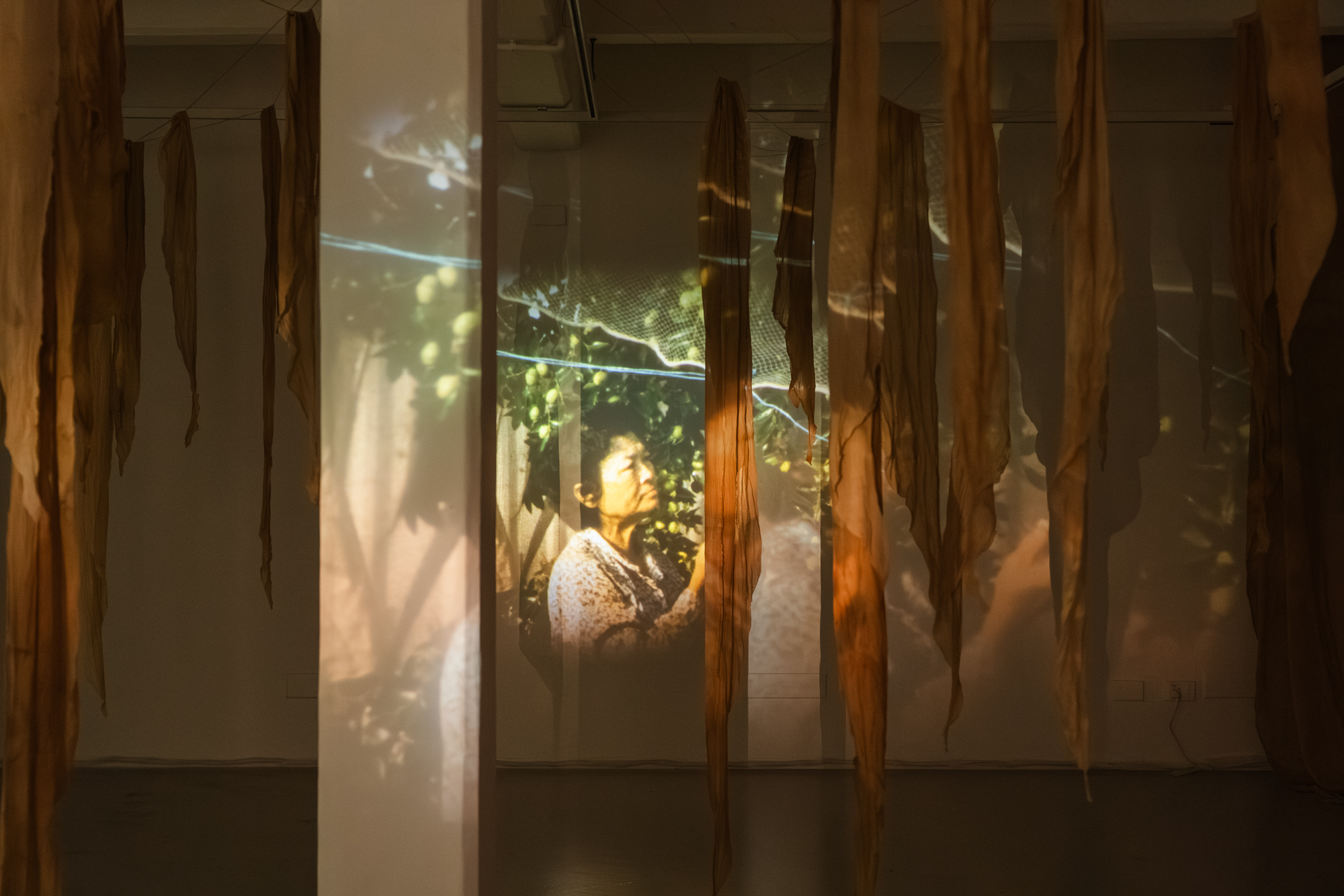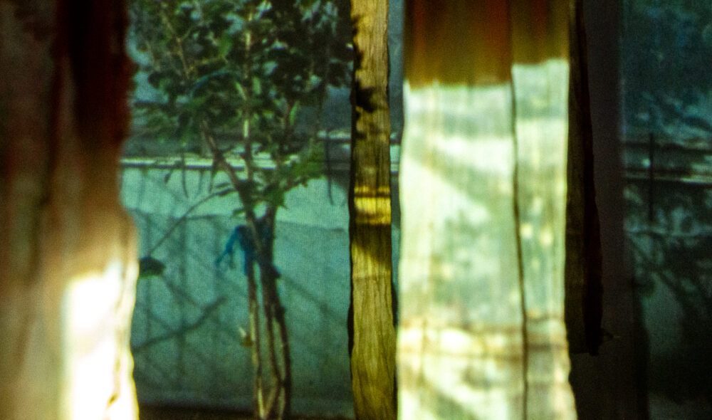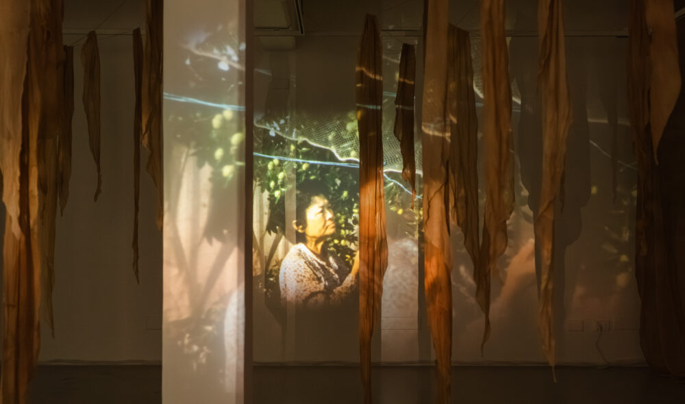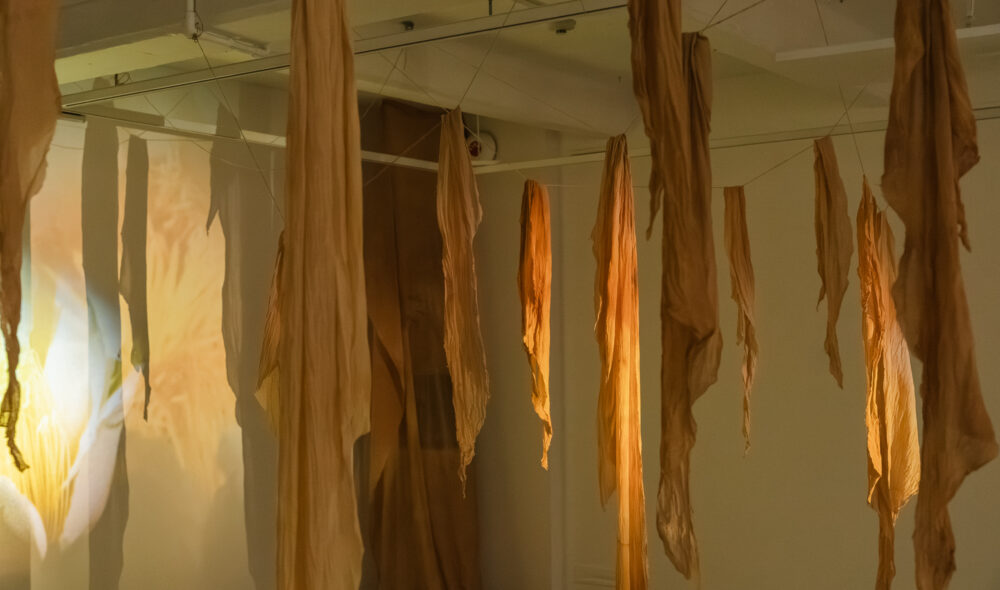 The garden is the studio—a place for growing plants and intergenerational family members to be nurtured by daily rituals. Captured over changing seasons on Super 8 film, the personal archive is projected onto leftover tea-dyed muslin reminiscent of dried plants. These ghost-like hanging pieces become fragments of memories.