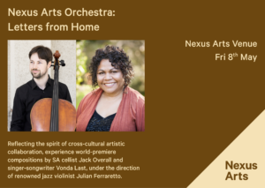 Nexus Arts Orchestra presents a collection of musical works reflecting its spirit of brilliant cross-cultural artistic collaboration. Letters from Home features world‑premiere works by South Australian cellist and composer Jack Overall, and Vonda Last, a Ngaanyatjarra and Pitjantjatjara woman, acclaimed singer‑songwriter and community arts leader based in South Australia. Under the direction of renowned jazz violinist and composer Julian Ferraretto, this evocative work journeys explores memory, identity and connection through sound