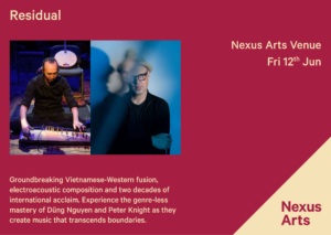 Residual explores groundbreaking Vietnamese-Western fusion through extended techniques & electroacoustic composition, creating music that transcends boundaries. Their 2011 album Residual, released on Belgium’s Parentheses Records, received acclaim: “Falling into an utterly genre-less wormhole” (Cyclic Defrost).